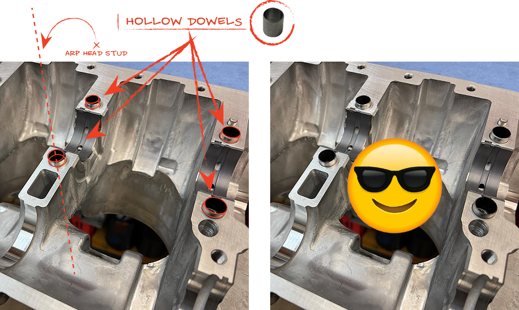 Up until now, due to the fact that there's only two small dowel pins for case alignment, there was no way to incorporate the ARP main studs into the RZR builds because the case halves would shift when torquing these higher grade studs to the proper torque specs. By installing eight hollow alignment dowels (shuffle pinning) into the each main stud orifice, each main journal remains true to .0002".